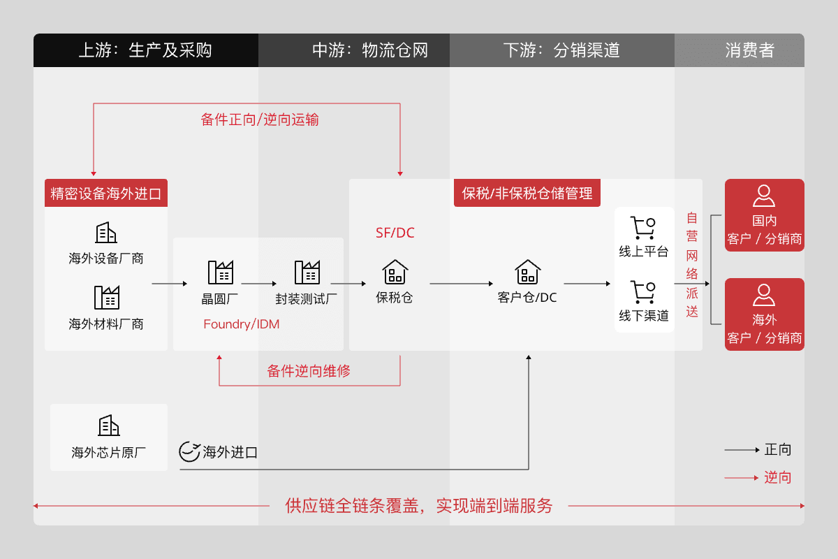 针对半导体设备及原材料的特殊性质,提供空运集拼、机坪接货、以车代库的端到端设备原料采购解决方案;基于分销产业集群分布情况,提供适配芯片分销解决方案;基于保税/非保同库的寄售备件解决方案,灵活运作管理,高效交付,降低客户物流成本,提升物流效率